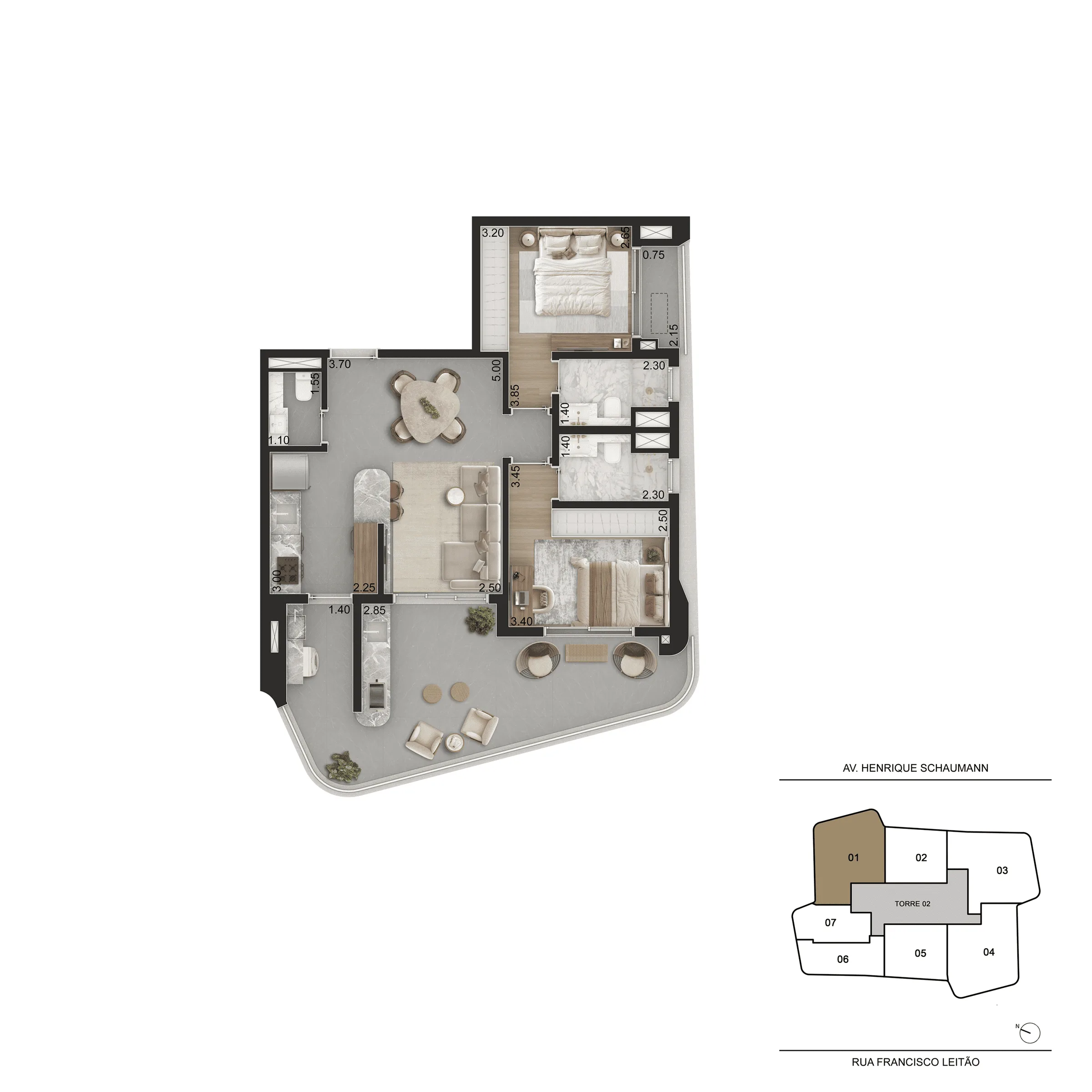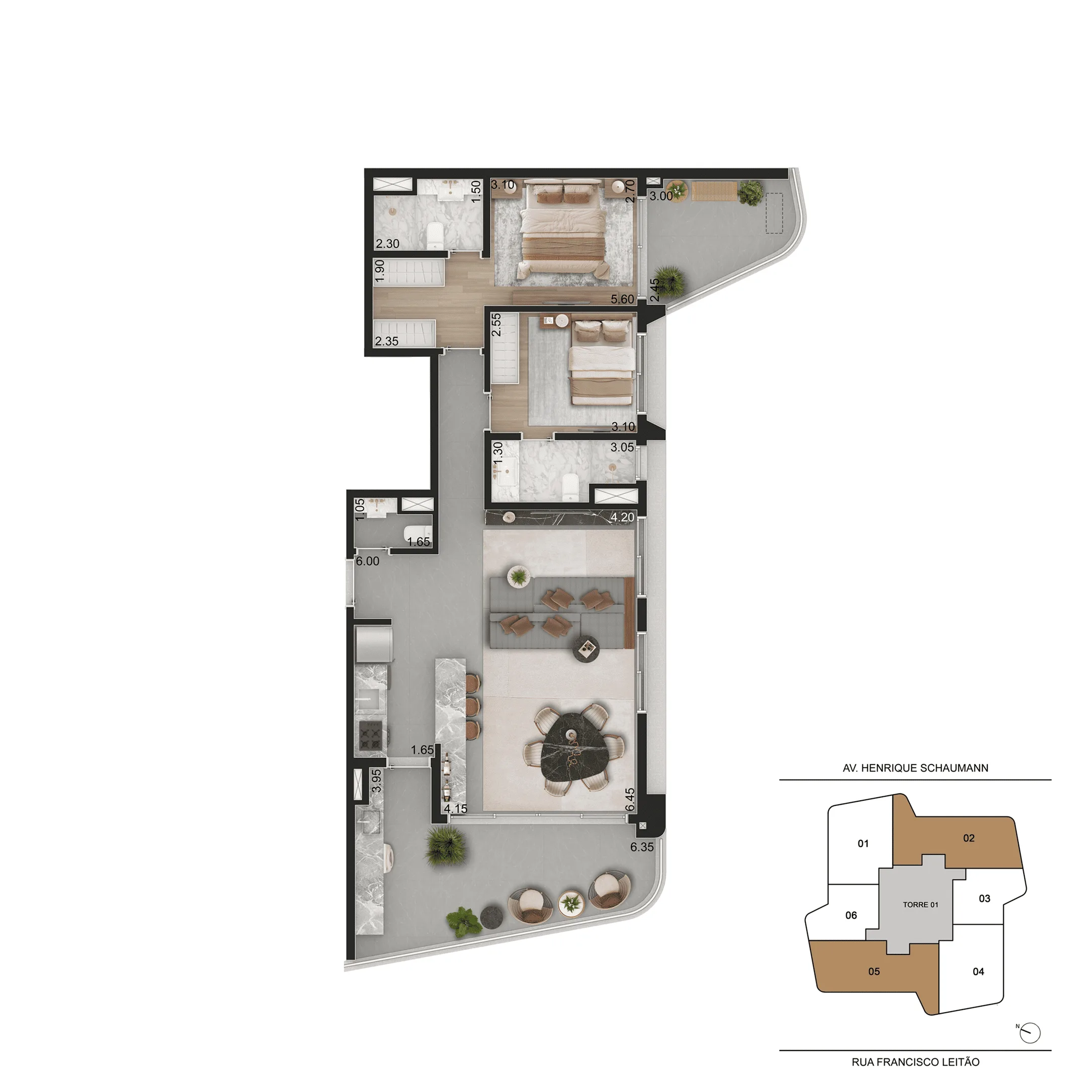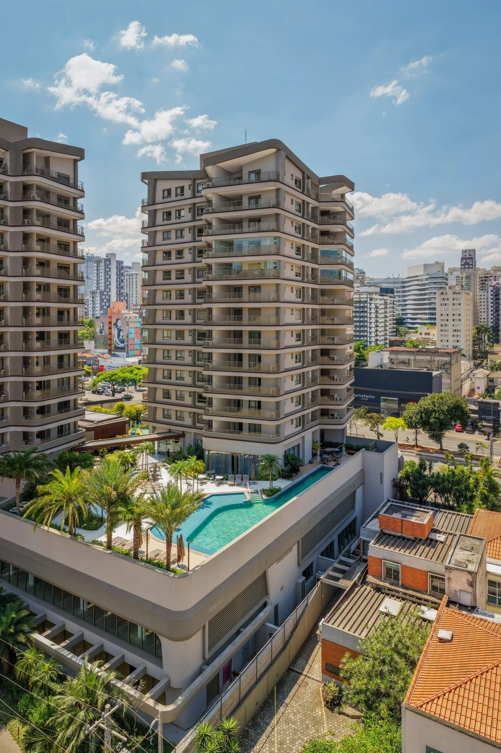 Localizado em Pinheiros, o empreendimento ocupa um terreno amplo e conta com duas torres e acessos independentes, oferecendo diversidade de plantas que vão de 44 m² a 166 m², entre studios, apartamentos, gardens e coberturas. As unidades foram pensadas para máxima eficiência, com boa iluminação, ventilação natural, terraços generosos e acabamentos de alto padrão.